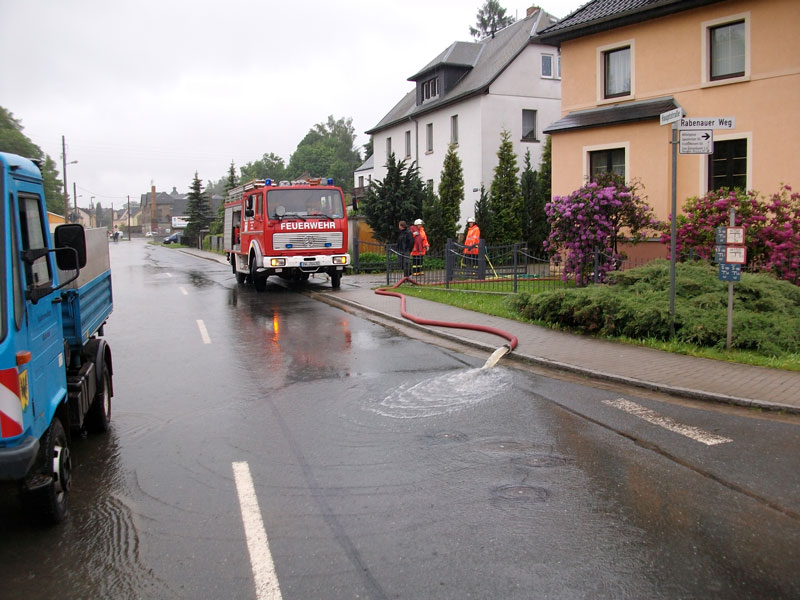 Aber nicht nur Oelsa war von diesem Hochwasser betroffen, große Teile des Landkreises wurden überflutet. Nachdem sich die Situation in der Ortslage entspannt hatte, wurden die Kameraden der Feuerwehr durch die Technische Einsatzleitung zu weiteren überörtlichen Einsätzen in Pirna und Schmiedeberg gerufen. In Pirna wurden während der Flut ganze Straßenzüge unter Wasser gesetzt. Die Keller und Tiefgaragen galt es nun wieder über mehrere Tage abzupumpen. Am 10.06.13 wurden die Kameraden durch die Einsatzleitung zur Hilfeleistung nach Obercarsdorf angefordert. Ein durch extremen Hagel und Starkregen entstandenes Hochwasser hatte im dortigen Gemeindegebiet für starke Zerstörungen durch Wasser und Schlamm geführt.