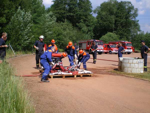 Mit einem beherzten Sprung ins weiche Polster konnte sich der Verwirrte in Sicherheit bringen. Auch die Jugendfeuerwehr hatte eine kleine Übung vorbereitet. Mit der Handruckspritze wurde ein Löscheinsatz auf die angrenzende Wiese aufgebaut. Die Anstrengung war den jungen Kameraden buchstäblich ins Gesicht geschrieben, jedoch konnten sie sich bei einer Mahlzeit aus der Feldküche ausgiebig stärken. Zuvor wurde aber noch eine Ehrung vollzogen. Dem langjährigen Jugendwart Horst Hannewald wurde die Ehrenurkunde der Landesjugendfeuerwehr Sachsen verliehen.