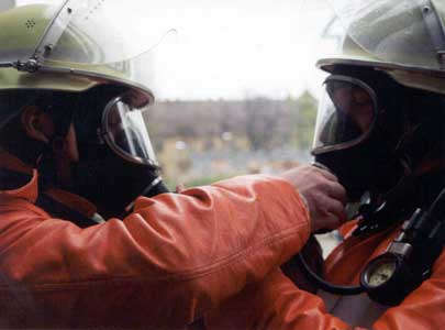 Der Angriffstrupp, nimmt seine Pressluftatemgeräte in Betrieb. Dazu wird erst einmal die Atemschutzmaske angelegt. Sie bedeckt Augen, Nase, Mund und Kinn des Trägers und muss absolut dicht sitzen. Sie bietet Schutz gegen Wärmestrahlung und mechanische Verletzungen. Das Sichtfenster besteht aus zwei miteinander verklebten Kunststoffschichten und bleibt selbst bei Beschädigung dicht.