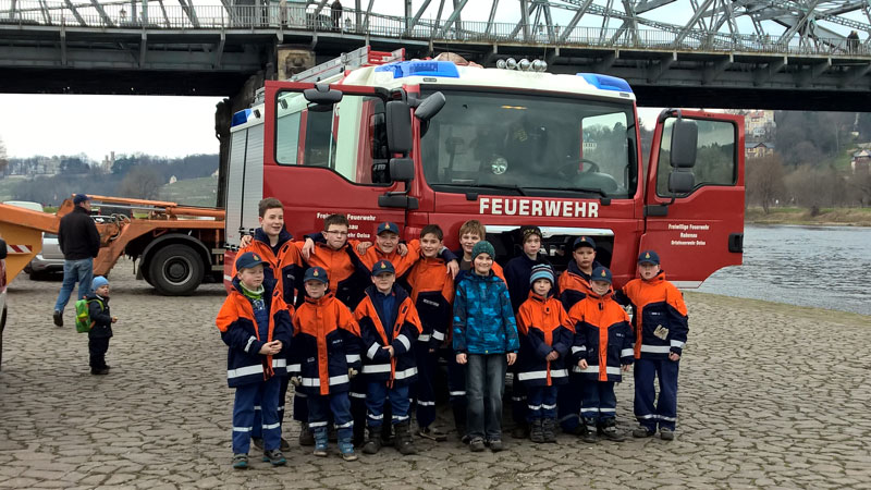 Morgens um acht war Treff am Oelsaer Feuerwehrhaus. Alle zwölf Kinder waren entsprechend der Vorgaben zum Unfallschutz in vollständiger Schutzkleidung der Jugendfeuerwehr erschienen, so dass wir uns über Rabenau, wo zwei weitere Mitglieder der Jugendfeuerwehr zustiegen, auf den Weg zum Blauen Wunder machen konnten. Pünktlich um neun konnte die Sammelaktion Richtung Tolkewitz und Laubegast starten.