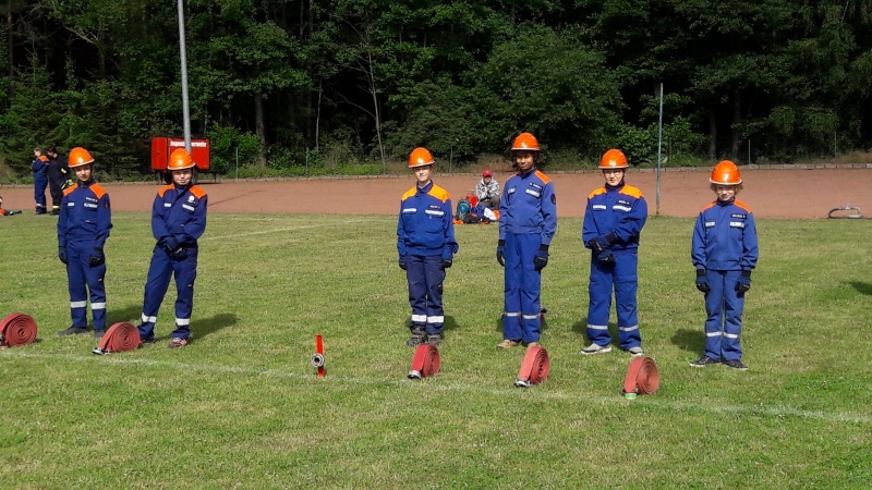 Die vergangenen Wochen wurden zur intensiven Vorbereitung genutzt und die erreichten Zeiten in den verschiedenen Disziplinen dadurch stetig verbessert. Also hieß es am Samstag für die Floriansjünger pünktlich aufstehen und um 8:30 Uhr in vollständiger Uniform am Waldstadion zu sein. Vor Ort ging es nach einem gemeinsamen Antreten und den Ansprachen mit den besten Wünschen gegen 09:15 Uhr zur ersten Disziplin. Insgesamt waren vier Stationen zu absolvieren. Neben dem geschickten Binden von Knoten, ging es um eine ruhige Hand beim Schlauchkegeln, schnelles und fehlerfreies Verlegen einer Schlauchleitung und das gemeinsame Zusammenarbeiten bei der Gruppenstafette. Unsere Jugendfeuerwehren starteten mit drei Mannschaften in der Altersklasse bis 13 Jahre und vier Mannschaften in der Altersklasse bis 18 Jahre.